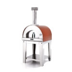 Maestro 60 è un forno a gas da esterno a cottura diretta. Superficie di cottura utile di 60×40 cm, per prestazioni identiche a quelle di un forno professionale. Realizzato in acciaio verniciato e acciaio inox, dotato di canna fumaria, cappello antipioggia, tubo e regolatore di pressione e termometro analogico. La porta è in acciaio con maniglia antiscottatura ed è dotata di una feritoia per visionare la fiamma. All’interno un batti fiamma in acciaio di grande spessore migliora la distribuzione del calore protegge la volta in acciaio da qualsiasi sollecitazione di calore. Le elevate prestazioni di Maestro 60 sono garantite anche dall’elevato materiale isolante che coibenta la volta, consentendo di raggiungere alte temperature in poco tempo. La perfetta rotondità della volta agevola la circolazione dell’aria, il bruciatore a gas è posizionato sul fondo per ottenere una perfetta distribuzione del calore, il circuito di uscita dei fumi obbliga il calore a restare ancora più tempo dentro alla camera di cottura consentendo un minor consumo di gas.