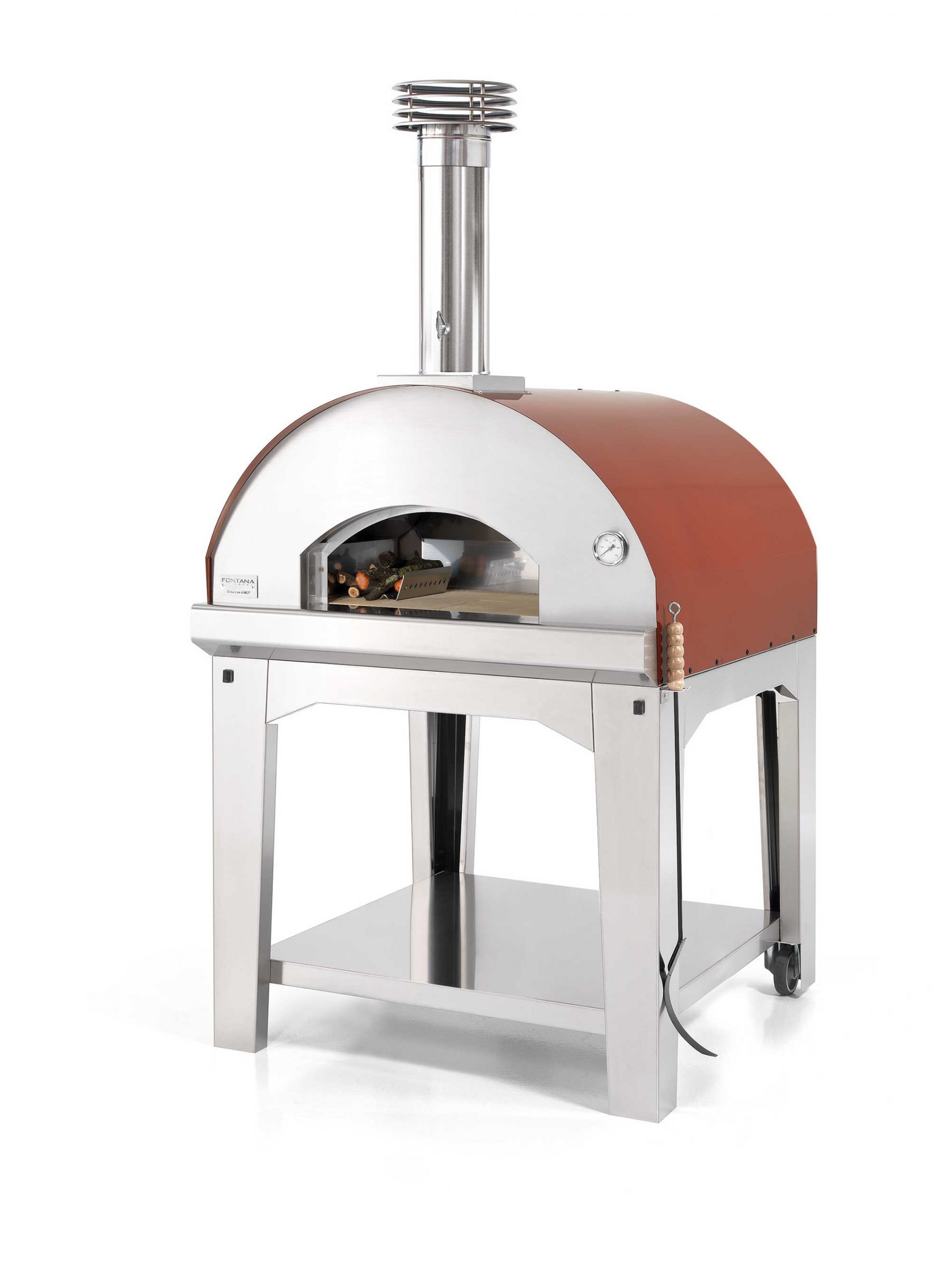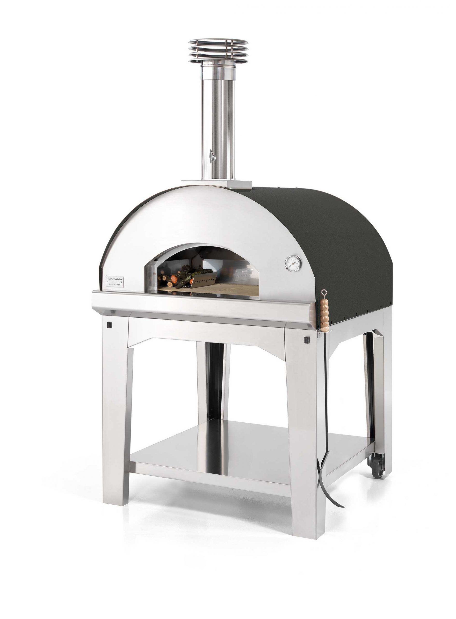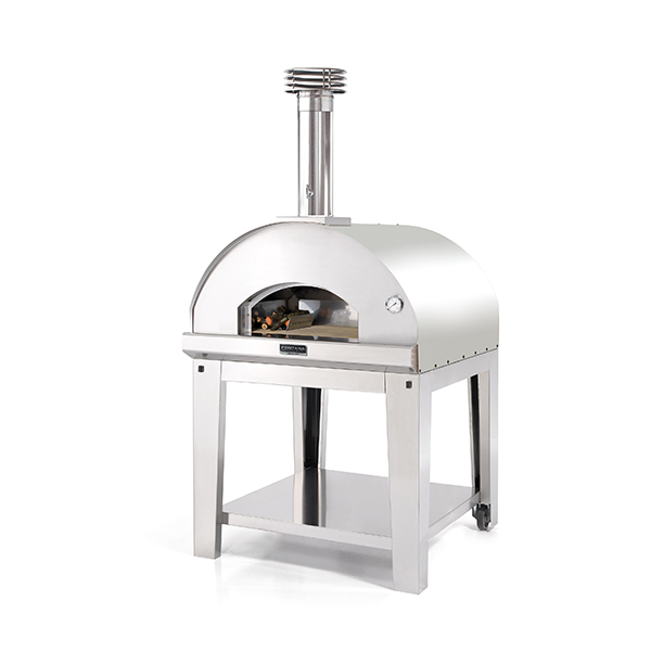 Forno a legna da esterno con camera di cottura da 80×80 cm utili. Dotato di pratico carrello in acciaio inox con piano d’appoggio, ruote e gancio porta utensili è fornito di piastra portalegna, utensile ravvivabrace, canna fumaria dotata di valvola di regolazione dei fumi e cappello, porta di chisura della bocca fuoco. Il piano fuoco è realizzato in chamotte refrattaria di alta qualità e certificata per usi alimentari. La struttura interna è in acciaio inox mentre l’esterna è in acciaio elettrozincato trattato con vernici ad alta temperatura per la massima resistenza al calore, alle intemperie e alla ruggine. La coibentazione del forno è realizzata in lana di roccia naturale e permette di contenere la temperatura più efficacemente e di evitare che la struttura esterna si scaldi troppo.