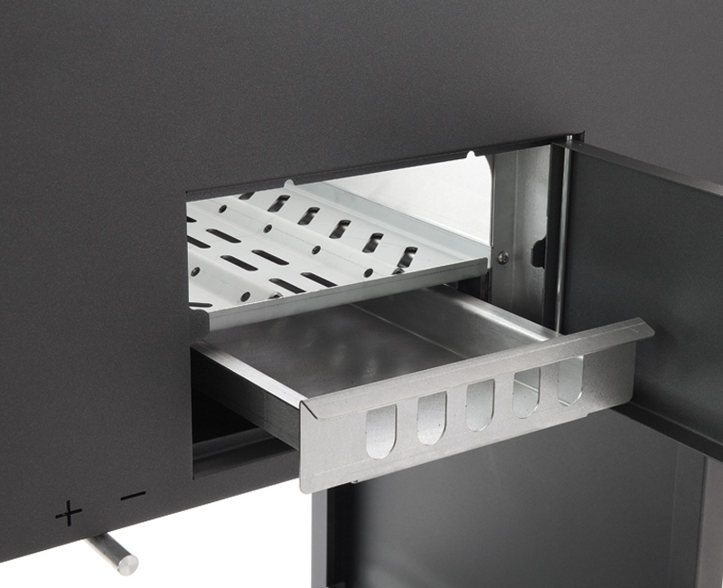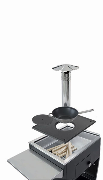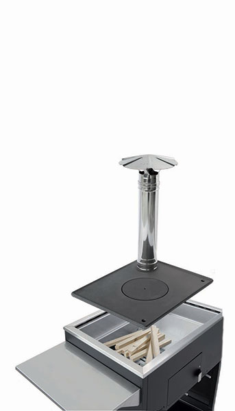 L’accensione avviene con estrema facilità grazie alla camera di combustione appositamente creata per facilitare questa operazione e per garantire una stabile e uniforme distribuzione del calore con ognuno degli accessori. Pizza&Cucina è dotato di dispositivo per regolare l’intensità della fiamma, di pratico sistema di recupero e scarico della cenere.